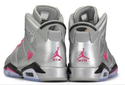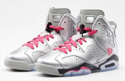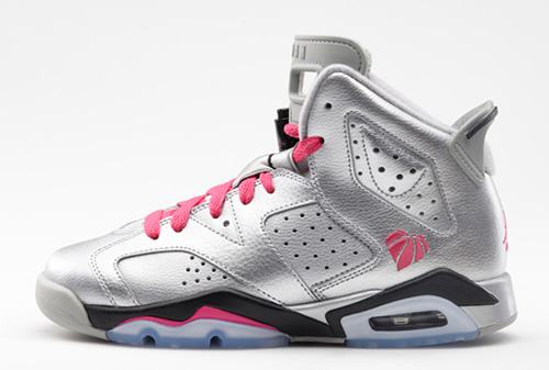 This is the new Air Jordan VI (6) "Valentines Day" GS (Grade School) sized which features a metallic silver, vivid pink and black color way. Every year Jordan Brand has celebrated the 23rd anniversary of each signature model, and each of the past year we've seen a "Valentine's Day" pair of the respective model. In 2012 the Air Jordan 4 got the V-Day treatment and last year the Air Jordan 5. Now this Air Jordan 6 has come to us for all female sneaker heads to wear during the holiday of love on February 14th. This is the perfect pair for a guy to give his girlfriend on VDay. Be sure to add this pair to your GS AJ collection today.