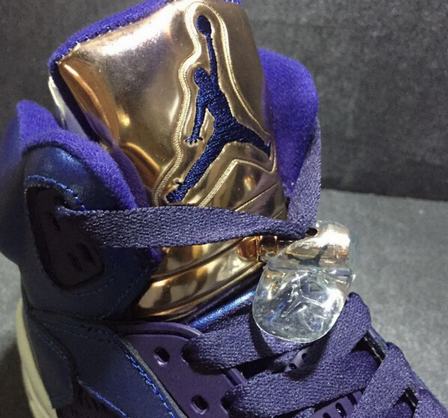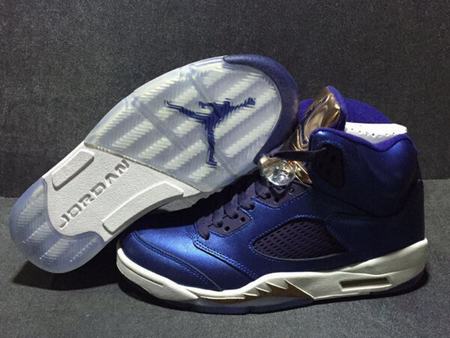 Recently, the network upstream came a pair of new color of the Air Jordan 5 "Bronze" shoes. You can see this Air Jordan 5 uppers overall dark blue as the main theme, the tongue and the bottom of the flame pattern is decorated with gold as an ornament with a white midsole and ice blue translucent crystal outsole.