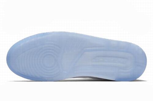 The large body of the shoe is made of white pebbled leather. It is made by stitching light gray cracked leather on the heel and heel. The white midsole and semi-transparent ice blue crystal bottom make it very refreshing.