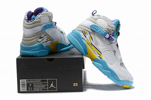 Air Jordan 8 Retro during the 1992-93 "Three-Peat" Championship season. The Nike Air Jordan 8 was the last Nike Air Jordan shoe that Jordan wore before his first time retirement. Jordan 8 had a lot more details, color and accents. The shoe was easy to get very warm due to the thick padding.