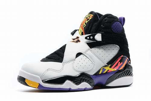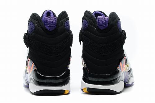 The pair of Air Jordan 8 has a white glossy finish with a light gray suede and a yellow-purple finish, and a black strap on the midsole, lining and upper straps.