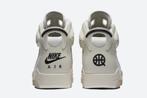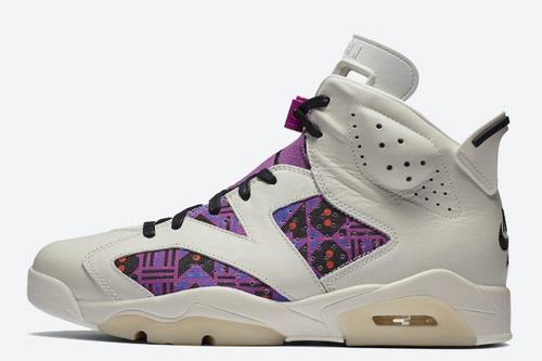 The second colorway upper of the air jordan 6 Quai 54 alternates between elegance and magnificence, combining a soft sail leather construction with a bright print on the outside and inside of the quarter. Due to the mix of purple, blue, orange and brown, this print is essentially a color offset from the graphics used by the other air jordan 6 and air jordan 1 low in the series. The left shoe retains the standard Jumpman brand cover on the tongue, while the air hits the heel, while the right shoe replaces both with Quai 54 graphics.
