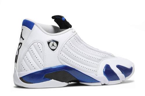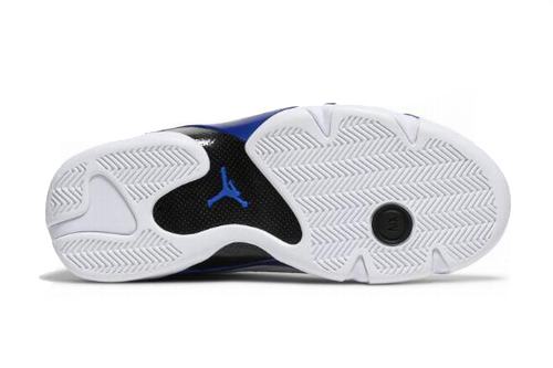 The air jordan 14 hyper Royal is covered with a large area of white leather, while the tongue and heel of hyper Royal are made of white smooth and durable white leather, which complements the details of the sole. The carbon fiber handle provides support under the foot. Inspired by Ferrari's shoe body shape, it is also extremely fashionable. With this color combination, the temperament is advanced and versatile. And this color is similar to Reggie Miller PE, I believe it will be favored by many shoe fans.