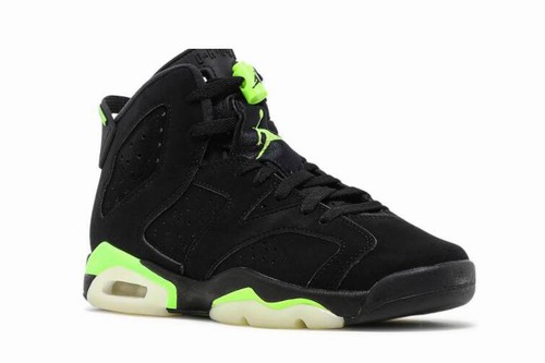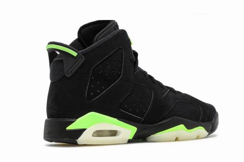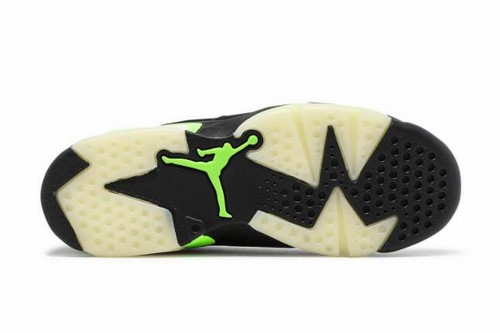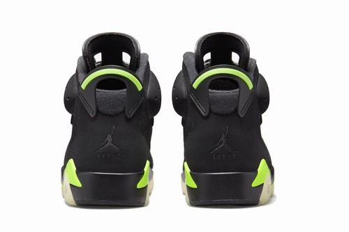 The Retro Air Jordan 6 Electric Green upper uses a black nubuck leather structure, reminiscent of the 2018 Oregon PE, the shoelace buckle, heel pull loop and tongue Jumpman brand logo on the Electric Green design highlights this point. Under the foot, the polyurethane midsole uses more electric green, which is used in conjunction with the visible air on the heel to provide cushioning. The luminous finish on the translucent rubber outsole completes the look.