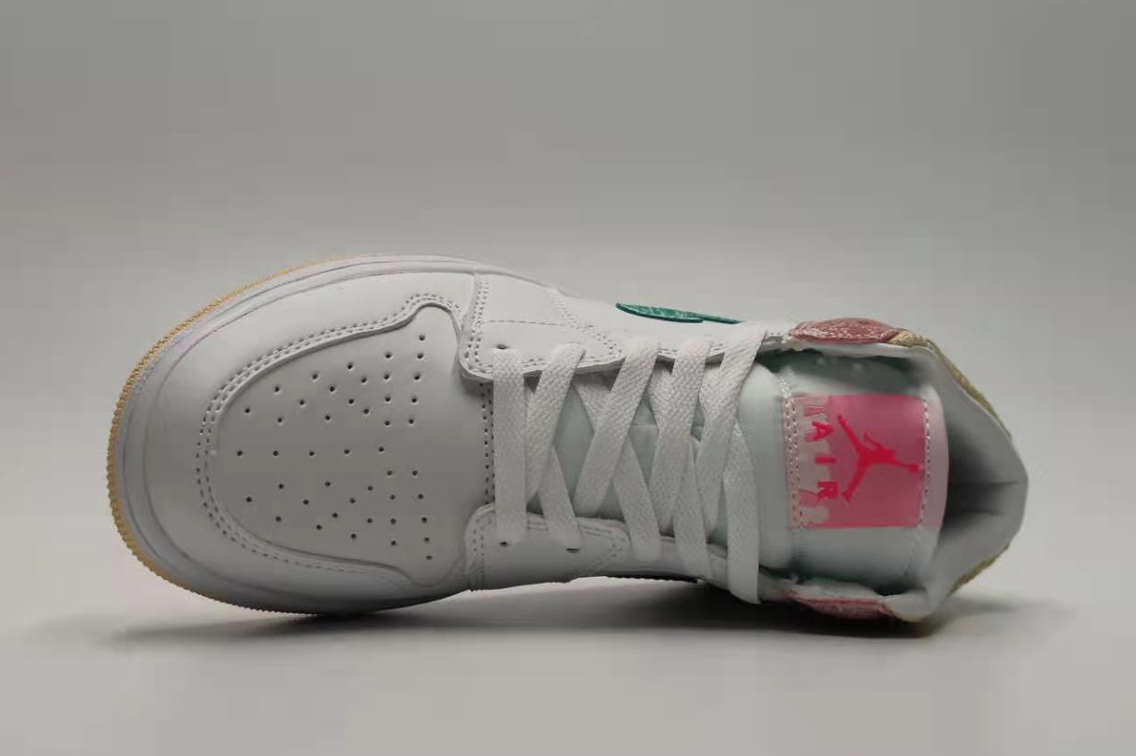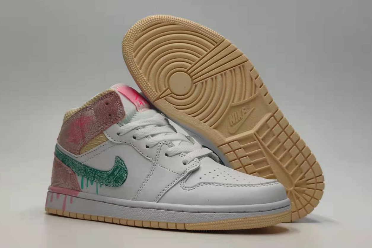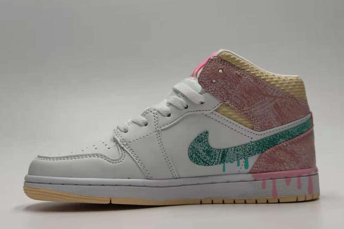 Air Jordan 1 Mid SE Strawberry Ice Cream The entire pair of shoes has a white leather structure, with a set of laces, tongue and a signature perforated toe. The tongue label uses a golden waffle knit collar and pink shade, green textured Swooshes and pink high heels are dotted with paint drops. The melting pattern on the heel of the midsole completes the design, like a melting ice cream. The sideways Swoosh Logo uses green makeup to form a contrasting visual effect with the pink shoe body. The white midsole on the soft yellow rubber outsole completes the design. Although the first half of the shoe is mainly pure white, the second half of the shoe is made of ice cream. The lifelike upper part is consistent with the ice cream cone. There is also ice cream on the side of the shoe. It is so amazing that people can't help but sigh, and this pair of shoes is still SE can see its particularity!