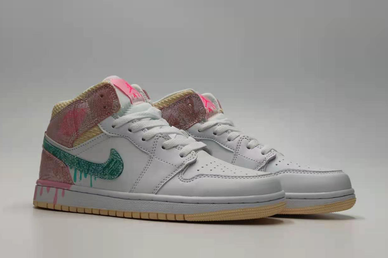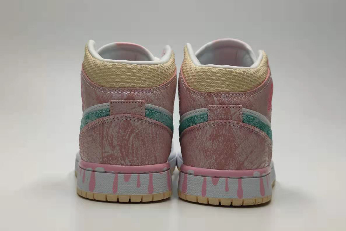 Air Jordan 1 Mid SE Strawberry Ice Cream The entire pair of shoes has a white leather structure, with a set of laces, tongue and a signature perforated toe. The tongue label uses a golden waffle knit collar and pink shade, green textured Swooshes and pink high heels are dotted with paint drops. The melting pattern on the heel of the midsole completes the design, like a melting ice cream. The sideways Swoosh Logo uses green makeup to form a contrasting visual effect with the pink shoe body. The white midsole on the soft yellow rubber outsole completes the design. Although the first half of the shoe is mainly pure white, the second half of the shoe is made of ice cream. The lifelike upper part is consistent with the ice cream cone. There is also ice cream on the side of the cheap jordan shoes . It is so amazing that people can't help but sigh, and this pair of shoes is still SE can see its particularity!