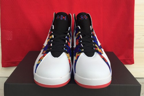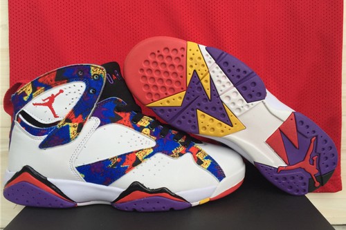 The upper of the shoe is composed of white leather upper and black tongue, with the geometric pattern of sweater made up of bright colors. The color selection of the details also echoes the pattern of the sweater. The black, red and purple collocation on the tongue is quite good. The colorful decoration of colorful details highlights the visual grip, which is quite fit with the consistent colorful splicing of AIR JORDAN 7. The peak grain that lets a person shine at the moment, the bold design that a variety of colors bump into color makes shoe money whole has nation quite and cheap jordans for women style restoring ancient ways. The Air Jordan 7 logo at the heel, and many AJ derivative products, use this pattern and pattern. As shown in the picture, the AJ7 has inner boots, so the wrap is fine, but the thin high top, ankle protection tends to be zero.