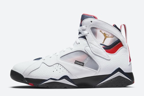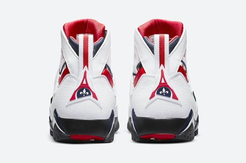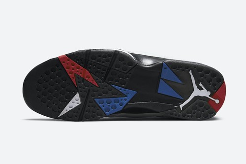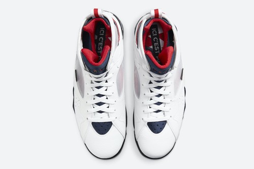 This Air Jordan 7 comes in white, college navy, Sport Royal and college red. The upper is made of white leather, while the mesh mesh provides breathability on the panel and ankle. A mixture of black, white and midnight navy appears on the midsole instead of the traditional Jordan 7 logo. A zigzag pattern is used on the insole to blend the above shades together, and the words "Ici C Est Paris" are spread on it. Finally, the appearance is mainly black, with navy blue, red and white.