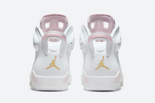 The upper of the Air Jordan 6 Gold Hoops is mainly white and is made of leather mesh. There are metallic gold decorations on the shoelace buckle, heel and part of the midsole. The tongue sole and heel are decorated with rose gold, jordans for cheap and There is a metal gold hoop on each pair of shoe tongues. Finally, with a pink and white midsole and a translucent outsole to complete the overall design, girls who like blingbling style must be irresistible.