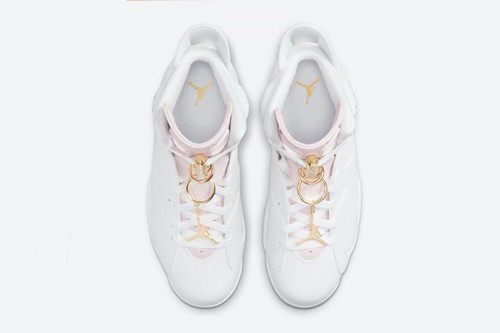 Air Jordan 6 Gold Hoops uses white, sail, metallic gold and almost rose color schemes. Inspired by gold earrings, this Air Jordan 6 adds interconnected gold rings, connected to the lace buttons of the shoes.