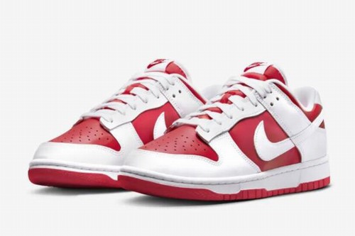 Dunk SB Low Championship Red features an authentic campus style, and Dunk Low's "White University Red" appears in two shades. Constructed of leather, the upper part of the shoe sports a university red finish on its backing, covering the entire white leather. The perforation on the toe box includes breathability, while under the foot, a two-tone rubber cup bottom includes a concentric university red rubber outsole for traction.