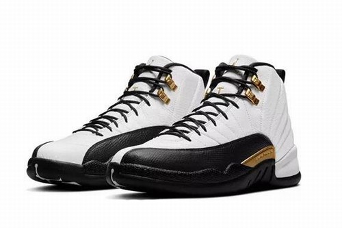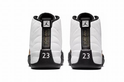 The entire pair of Air Jordan 12 Royalty shoes is composed of white leather upper with black lining, laces, fenders, outsoles, etc., combined with "gold buckle", nameplate and tongue gold JUMPMAN for embellishment.