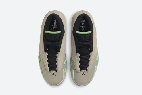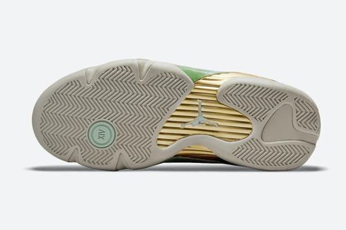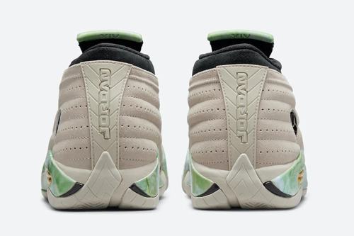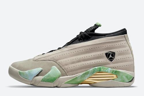 Dressed in a light bone and white color scheme. This low-top Air Jordan 14 features a Light Bone suede sole with black on the tongue, laces, collar and lining. Highlights of the shoe are the green air jordan 13 performance Dali stone print on the tongue and midsole as well as the airjordan1mid metallic gold calf plate.