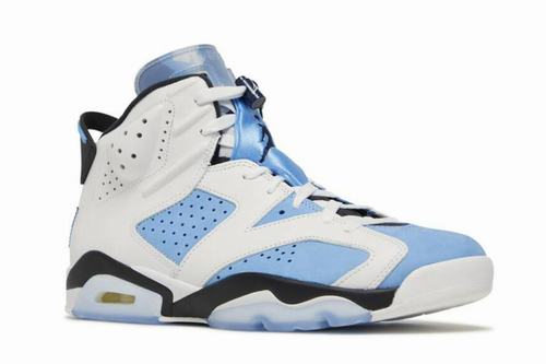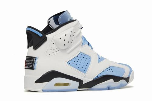 The Air Jordan 6 Retro UNC Home pays homage to Michael Jordan's alma mater with a colorway reminiscent of the University of North Carolina. One of the most popular colorways in the Air Jordan lineup, the North Carolina colorway features the classic loop sneaker featuring a white leather upper with University Blue nubuck padding. Navy blue appears on the molded TPU heel tab and collar lining. The navy blue is repeated on the midsole, which contains visible Air-sole cushioning. The overall use of university blue and white stitching design, the tongue part uses blue gradient texture, jordans for cheap the visual effect is very good, and the heel is also matched with the Jumpman Team label of university color matching. It presents a very simple and beautiful visual effect, with a matching transparent ice bottom super strong color matching.