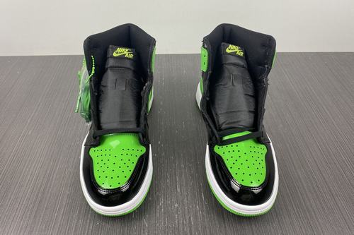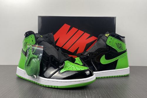 Air Jordan 1 High OG Pine Green Black classic silhouette with patent leather surface bright Black and Green such contrasting tones constitute Swoosh, toe part, outsole is bright Green, etc.
