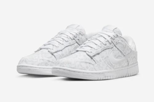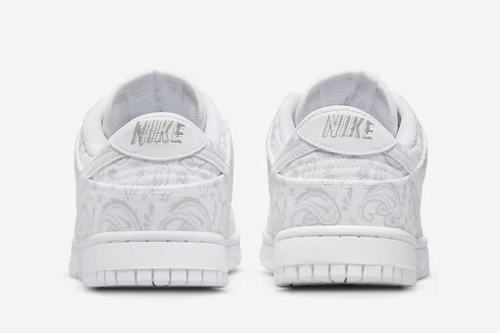 Born in 1985, the Dunk went viral with its unique preppy colorway, set off a fashion trend, and eventually swept the world as an enduring classic. The Dunk Low 'White Paisley' features a canvas upper with a white paisley pattern covering the entire upper for an alluring appeal, and modern shoemaking technology for a comfortable foot feel. On the Swoosh logo on both sides of the shoe body, the leather material is still used, and the simple white is very consistent with this theme. Afterwards, a light gray finish is added to the tongue embroidered logo and the NIKE position on the heel. Finally, the white midsole and outsole complete the overall design.