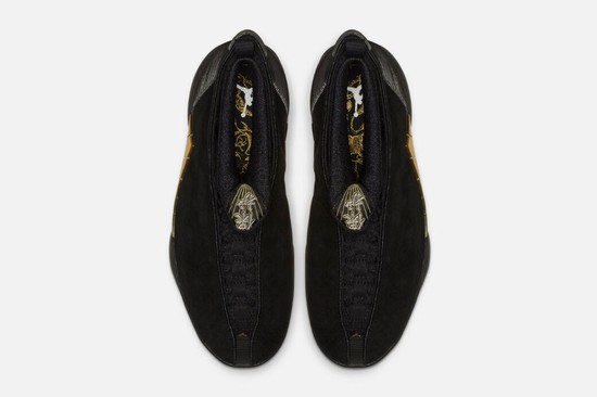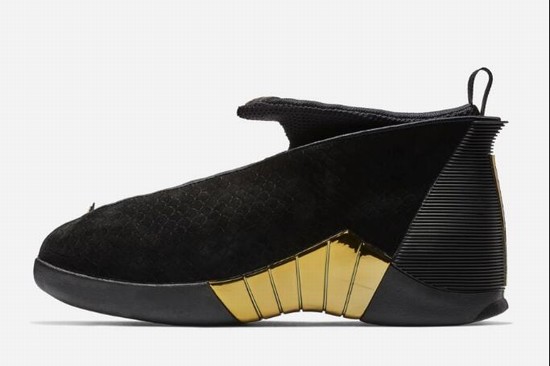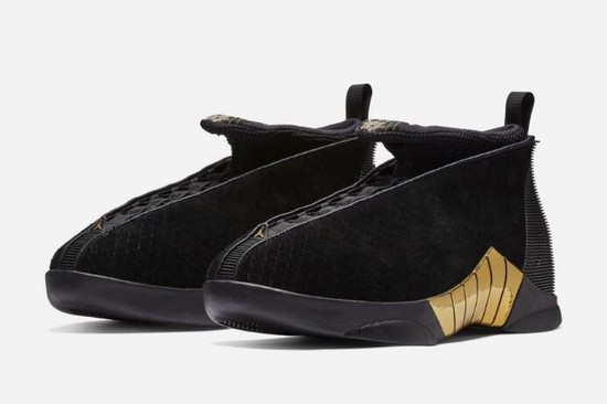 The AJ15 features a unique, exaggerated tongue that looks like Michael Jordan sticking his tongue out, while the Air Jordan 15 Doernbecher features a rich black suede dragon motif. The combination of black and yellow has both impact and gold accents including Donovan's birthday and a symbol of Japanese protection.