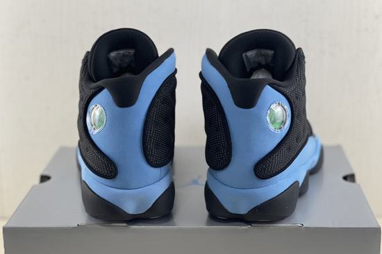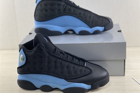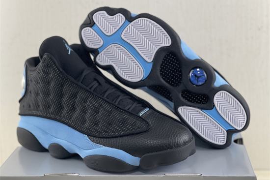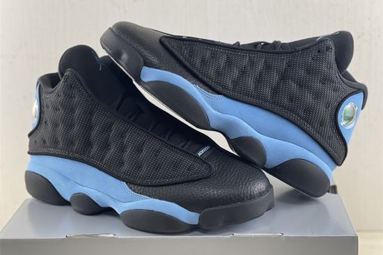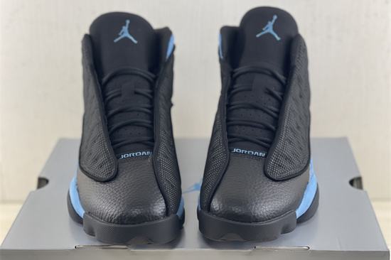 New Air Jordan 13 Black University Blue color scheme. The avant-garde silhouette of the shoe body is made of high-quality black material. At the same time, the heel is layered with University Blue, which is matched with the element of University Blue in the sole. The signature "Leopard eye" at the upper is presented in green.