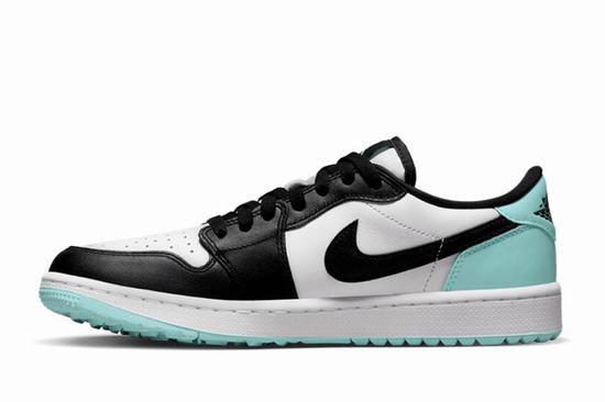 Air Jordan 1 Low Golf Copa adopts white leather as the base tone, combined with Black TOE color scheme. The heel and outsole are embellished with refreshing mint green, presenting striking color contrast effect. The tongue, insole, and outsole are decorated with Jumpman Golf designs to make a statement. The outsole grooves have been deepened to better suit golf, ensuring superior grip.