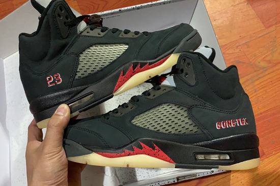 Most of the Air Jordan 5 Gore-Tex Off-Noir uppers are mainly black, with red shark teeth on the midsole, which is very similar to the black Supreme x Air Jordan 5. There is no eye-catching SUP word in the breathable mesh on the side of the shoe, both the appearance and the temperament make people dream back to 2015. The highlight of this new pair of shoes is not only the resemblance to the former ruthless shoes, but also the special design on the material. The entire vamp is fully blessed with Gore-Tex waterproof technology, so you no longer have to worry about wearing cheap jordan shoes in rainy days! Gore-Tex and 23 embroidery on the heel add a touch of OG. The overall temperament At first glance, in addition to the lack of eye-catching SUP words in the breathable mesh on the side of the shoe, Gore-Tex embroidery is also embellished on the heel, which is a rare design in the entire series.
