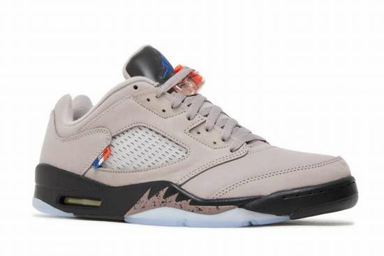The PSG x Air Jordan 5 Retro Low upper is presented in gray, which is quite refreshing, with a blue trapeze logo on the tongue and a red shoelace buckle, echoing the color scheme of the shoe. The shoelace head and cheap jordans side label are decorated with the French flag red, white and blue, and the Paname wording has also been retained. The heel is embellished with a one-of-a-kind flame lacquer seal, showing the PSG x Jordan Brand joint identity.