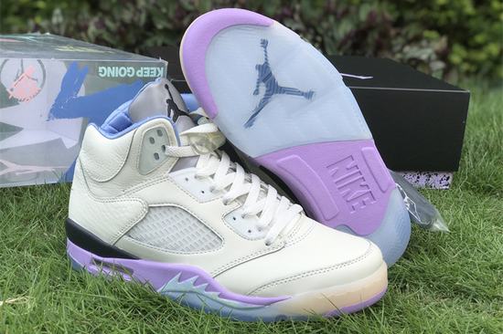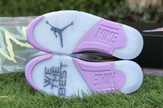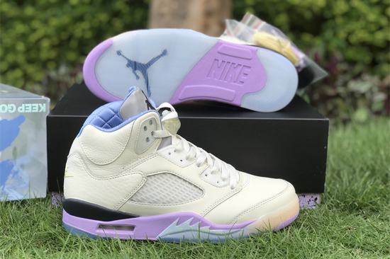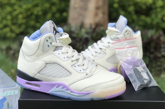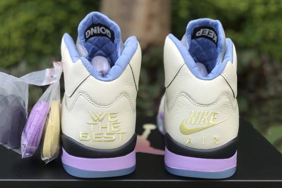 Air Jordan 5 X DJ Khaled We The Best Sail has an off-white leather upper with a purple midsole and a blue finish on The shark teeth section of The midsole. THE right foot is THE Swoosh design of THE first year, THE left heel is embroidered with WE THE BEST, THE three-dimensional uplift of THE upper is changed to leather stitching, a little cotton candy color feeling. THE crystal outsole shows THE "WE THE BEST" and THE "heel", THE inner lining is quilted and THE inverted label on THE inside of THE tongue has been changed to "KEEP GOING". CRAZYCXFK shoes come from white and green label bubbles, THE left heel is embroidered with WE THE BEST, a little cotton candy color feeling.