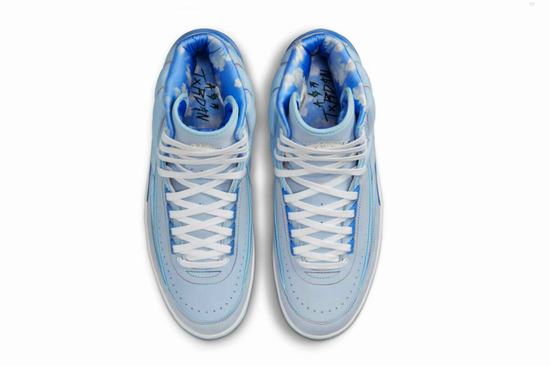 This J Balvin x Air Jordan 2 is designed in grey and blue. The shoe body and lining have a large area of blue sky and white clouds and its personal logo element. Other details include cloud graphics on the heel and lining, personal brand on the inside of the tongue and the iconic smiling face on the heel.