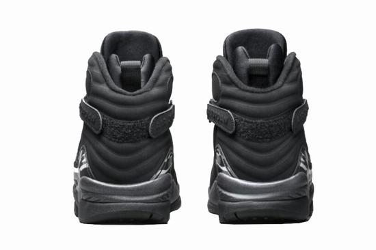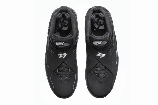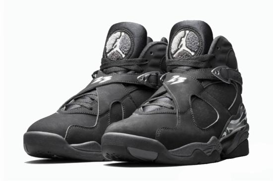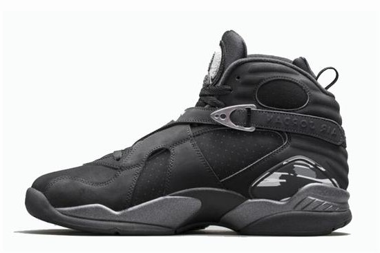 One of the first non-OG color schemes for the Air Jordan 8, the black and chrome AJ8 version reappeared. The shoes became a classic after they were first released in 2003. The Air Jordan 8 Chrome uses a black upper to incorporate chrome throughout the shoe style, subtly incorporating the Air Jordan 8 Playoff and Air Jordan 8 Aqua design concepts. Air Jordan 8 Chrome returns along with several other VIII collections (see Air Jordan's 2015 Vintage collection)