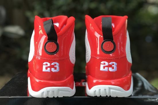 The Air Jordan 9 Gym Red colorway is quite similar to a pair of Air Jordan 9 Samples from 2013. The body of the shoe is spliced with classic red and white tones, and the fine-textured leather is matched with a very shiny patent leather material, presenting a classic retro and gorgeous atmosphere. Air Jordan 9 Gym Red dresses up the shoe body in classic white and red colors. The material is made of leather and patent leather. The shoelace buckle, the Jumpman logo on the sole and the heel of the shoe are all embellished in black, forming a strong visual effect! A bold embroidered "23" lettering on the heel makes a statement!
