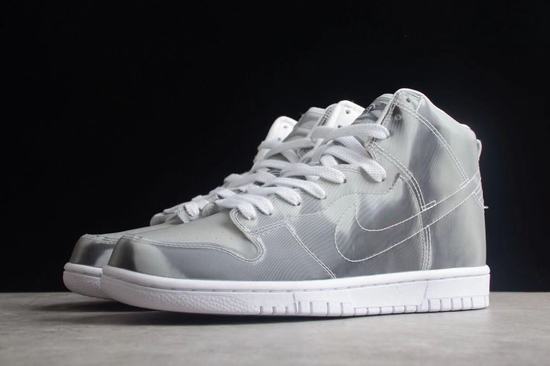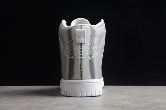 CLOT x Dunk High ICE flash card liquid silver high-top sneakers DH4444-900. The logos of Dunk and CLOT are reflected from different angles, and the upper is covered with metallic silver. The joint recognition is not low. The whole body of the shoe is covered with liquid silver patent leather, which has a flowing visual effect. In fact, the whole upper of the shoe is made of flash card shoe material. The metal shape creates a strong sense of the future, and the traditional tongue label is composed of flash card shoe materials.