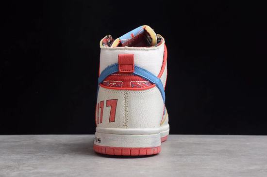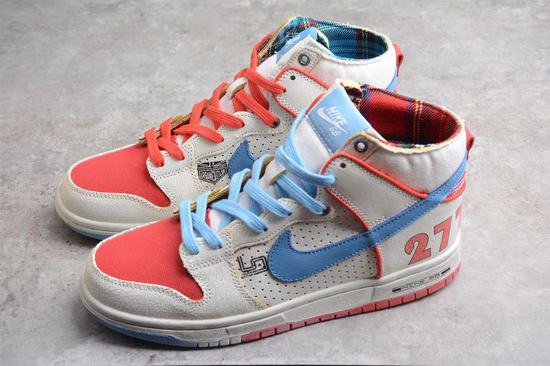 The Ishod Wair x Magnus Walker x SB Dunk High pair of shoes is dominated by a large area of white, supplemented by blue and red two-color embellishment details, and the design is inspired by Walker's favorite Porsche 911 T277. The body of the shoe is made of aged leather with cracks, and it is matched with the canvas material at the toe cap and the upper position. The blending of the two materials makes the body of the shoe more layered. The word "277" is written on the heel, which not only highlights the identity of the joint name, but also adds a touch of eye-catching details to the shoes. The inside of the shoe body also has the words Urban Outlaw, representing the Porsche documentary "Urban Outlaw" in 2013. The inner lining is presented in red and green plaid, which is also Magnus Walker's favorite daily clothing, once again showing his special identity. Finally, it ends with a white outsole with wearing traces, and the word "SB" is written in Porsche font on the heel to complete the overall shape design.