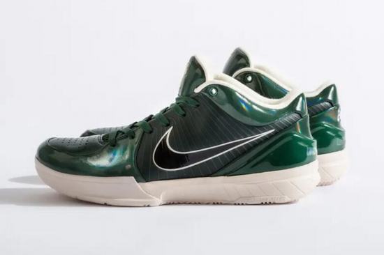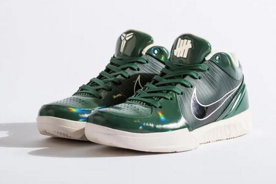 Undefeated x Kobe 4 Protro "Fir" was launched in August 2019 as part of a four-piece collaboration to celebrate Mamba Day. The shoes come in a dark green design, with an upper made of patent leather mixed with a synthetic material incorporated into Flywire, all mounted on an off-white midsole. Unique brand highlights include the Undefeated logo printed on the heel and the retailer's Five Blows logo located at the top of the left tongue.