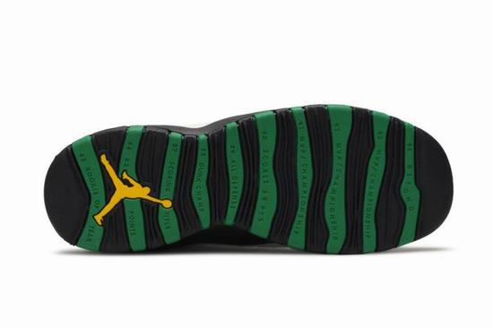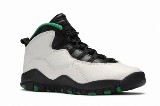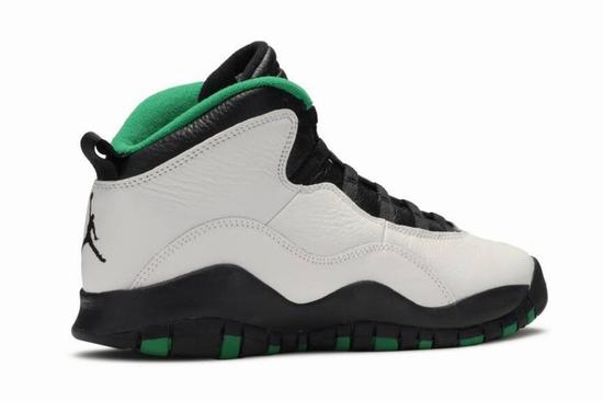 The 2019 version of the Air Jordan 10 Retro "Seattle" represents the first re-release of a colorway that released in 1995 as part of the original City pack. Inspired by the defunct Seattle SuperSonics, the mid-top sports a White tumbled leather upper with Black detailing on the tongue, collar and midsole. Kelly Green accents appear on the collar lining and outsole, the latter engraved with MJ's early career milestones.