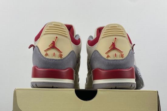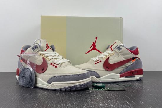 Air Jordan 3 Fear x Off White The whole pair of shoes are based on Air Jordan 3 "Muslin", beige canvas material shoe body with gray suede reinforcement, the texture of the shoe body is quite unique. Air Jordan 3 Fear x Off White The heel and collar use red embellishment, making the whole pair of shoes more eye-catching than the original. In terms of details, a huge red Swoosh with Off-White style is added on the side to further enhance the eye-grabbing effect. In addition, the inside of the shoe and the red midsole are also decorated with Off-White style words, showing the joint identity achieved through customization.