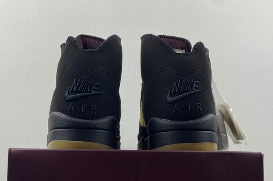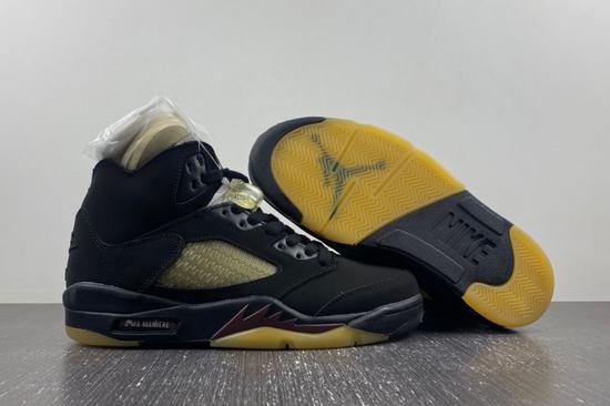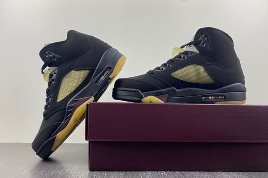 The Air Jordan 5 Black x A Ma Maniere boasts a black suede upper adorned with retro burgundy accents. The midsole and side mesh exhibit a slight yellowed, vintage look. The suede detailing is a co-branded effort, giving the shoe a resemblance to the Air Jordan 5 Toro Bravo, with its recognizable tongue. Burgundy accents in the details contribute to an overall vintage aesthetic. It's highly likely that the shoe is constructed from full suede, considering the typically elevated collaborative standards upheld by both parties. The standout feature is the "Yuanyang" tongue, making it incredibly recognizable. The slightly yellowed midsole and side mesh enhance the retro appeal.