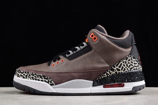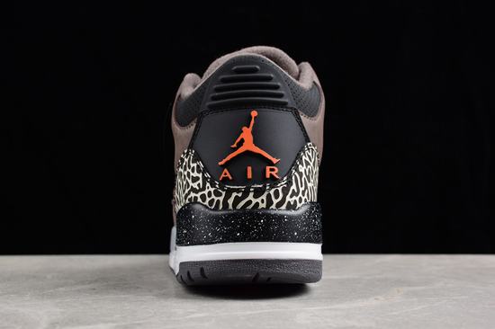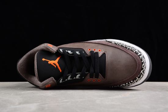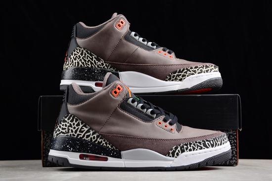 The Air Jordan 3 Retro Fear boasts a black rubber outsole and a sumptuous brown suede upper. A captivating black and white speckled midsole graces the heel, accentuated by a striking orange contrast design. The upper marries rich brown and black elements. Predominantly cloaked in luscious brown suede, the shoes exhibit subtle yet impactful bright orange embellishments within the predominantly dark color scheme. Iconic elephant crackle patterns adorn the toe and heel of the Air Jordan 3, and the signature white splash pattern, an indispensable facet of the Fear Pack, graces the outer midsole. The Jumpman logo, "Jordan" branding on the sole, and midsole air cushion all take on a cheap jordans on sale brilliant orange hue, ensuring a vivid and striking appearance. The shoe body, enveloped in full suede, delivers a sense of stability, with the toe box and heel adorned with the iconic elephant print patterns associated with Air Jordan 3. A grayscale and black midsole seamlessly rounds off the overall design. The full suede construction ensures a grounded texture, beautifully enhanced by orange details and a crackle pattern for added stability. The predominantly dark shoe body creates an evocative atmosphere, with the classic burst pattern elements of Air Jordan 3 subtly complementing the brown backdrop. The shoelace eyelets, tongue Jumpman logo, and heel accents are all adorned with vibrant orange, elevating the shoe's overall aesthetic appeal.
