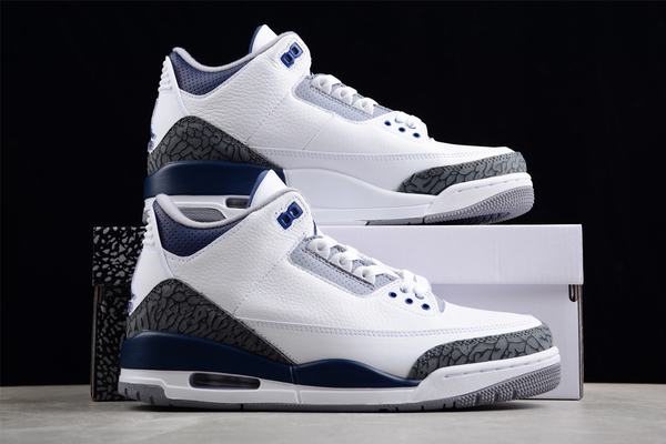 As one of the most popular shoe styles in the current generation, the AJ3 shoe body is entirely covered with leather shoes, with a white base color and navy blue. The shoelace holes, midsole and other details are embellished, and the crackle pattern elements are retained. The classic white leather shoe body sets the tone for the overall look, with classic crackle patterns embellished on the toe and heel. The midsole, upper and other parts are covered in navy blue, which adds to the appearance. The shoelace holes, midsole and other details are embellished, and the crackle pattern elements are retained. A large area of white with classic burst patterns and midnight blue embellishments is low-key yet high-end. The pebbled leather-wrapped cheap jordan shoes body ensures the Air Jordan 3's consistent quality. As the weather turns cooler, the chances of wearing it are also greatly increased. It is a good shoe for autumn and winter. And thanks to the excellent leather material, Air Jordan 3 can definitely be said to be a pair of shoes that are more comfortable for every wear and tear, and can steadily meet the needs of daily commuting and going out on the street.
