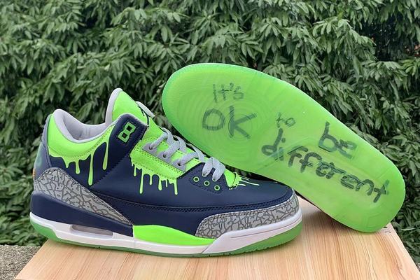 The new Air Jordan 3 Doernbecher "Hugo" as a whole is designed with the color of the author's favorite football team, the Seattle Seahawks jersey, the whole body is covered with navy blue, and the fluorescent green glitter is decorated with ink design, which is very attractive. The upper is made of classic leather material with good texture. At the same time, the LACES also have a fluorescent design, which will have a better visual effect in low light. The Jumpman Logo on the heel is embellished with the word "Hugo" in a graffiti style to highlight the identity of the shoe. Finally, the white midsole is finished with a green transparent outsole, and It is printed with its motto "It's OK to be different" to perfect the whole shoe design. In homage to the little boy's nickname.