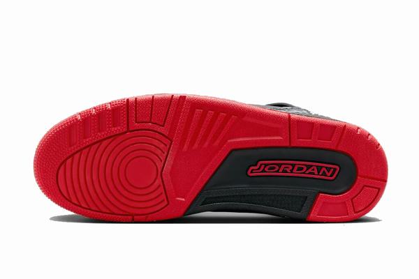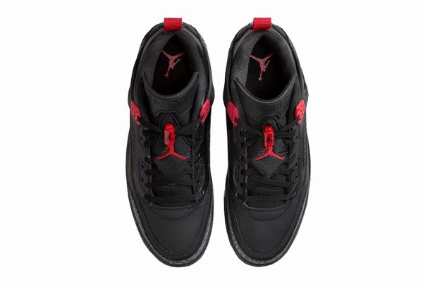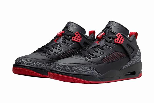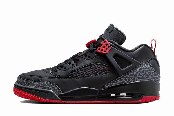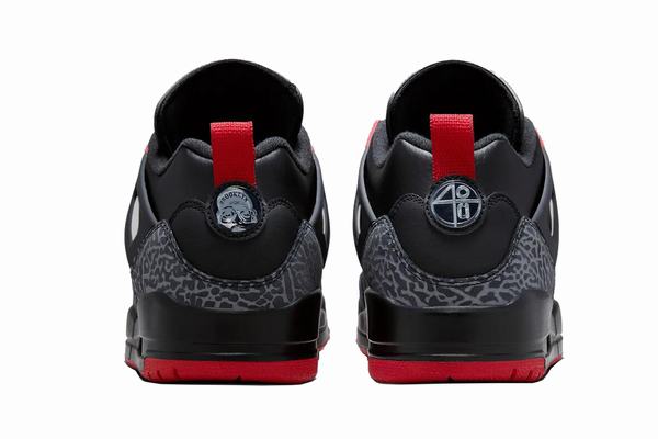 The Air Jordan Spizike is Low Bred with tongue and lace fastenings, and the AJ4's side triangle stabilization patch and lace holes appear in black and gray. The AJ5 profile is based on the design by adding the AJ3 blast cracks and soles. Unlike the original Air Jordan 4 predecessor, the grayscale tone of this hybrid shoe is drastically reduced, as the elephant print panels on the fender and heel are dedicated to a "cool gray" tone. The remaining area of tumbling leather takes on a jet black hue and takes up almost the entire upper. The nylon tongue structure and Air Jordan 8's Chenille tongue guard are further pitch-black, while a vibrant "gym red" hue forms the back half of the OG color scheme, running through the LACES lock, wings, heel tag and upper, then peeking from the middle. The webbed Windows are layered.