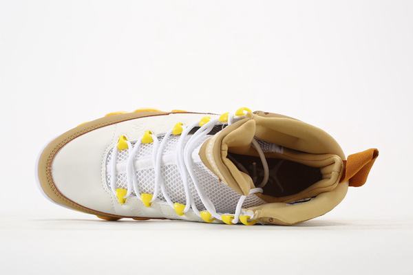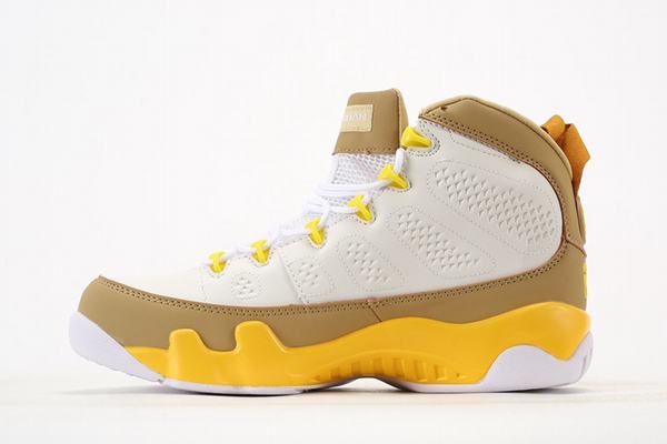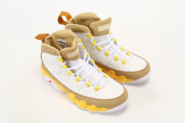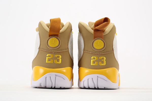The Retro Air Jordan 9 White Yellow Brown is made from typical white leather and fabric products, with a trendy gray patent leather frame. The total shape exhibits a classic temperament; there are also ain9 timeless triangular dark patterns on both sides of the footwear body, and the white mesh tongue is matched with a red shoe lace buckle, which brings a lot more color layering to the entire footwear. The earth and jumpman logo design at the heel and the pull ring are both embellished with renowned red to highlight the identification of the sneaker. The massive 23 needlework on the heel, the mini flying male on the midsole and the jumpman logo on the outsole are all in red. The midsole is painted with a brilliant gray throughout the footwear, extending up from the heel to the pull ring, echoing the shiny leather top.