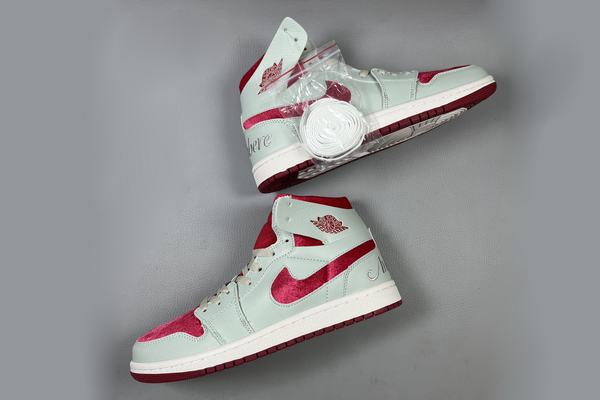 This pair of Air Jordan 1 Zoom CMFT 2 Valentines Day is an unique version designed for Valentine's Day. It is mostly light green with bright red decorations, and the entire is full of a solid sweet atmosphere of love. The shoe body is wrapped in lychee natural leather and red velour material, and the heel is stitched with words "atime awhere" (whenever and wherever), which is full of Valentine's Day ambience.