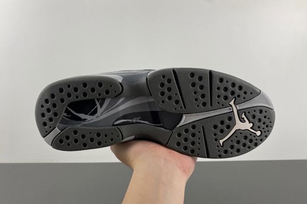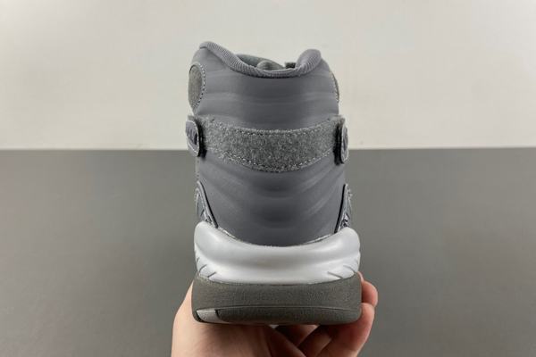 Retro Air Jordan 8 Cool Grey vamp is made of high-quality suede material, soft and delicate to the touch, with good air permeability and durability. The whole shoe body presents a consistent gray tone, giving a harmonious and unified aesthetic feeling. In the toe part, the designer cleverly incorporated the white Jumpman logo, making the overall design more sophisticated. In addition, the LACES are also decorated in white around the holes, further enhancing the overall visual effect.