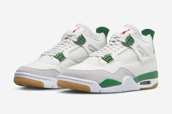 On the outside, the shoes are mainly white in color, with pine green and gray details to create a fresh and natural visual effect. The upper of the shoe is made of high-quality leather material, which provides a delicate touch and excellent durability. The iconic Wings logo on the side and the classic Jumpman logo on the back are embellished in red, complementing the overall tone. In addition, the shoelace buckle also adopts a special green design, further highlighting the joint identity.