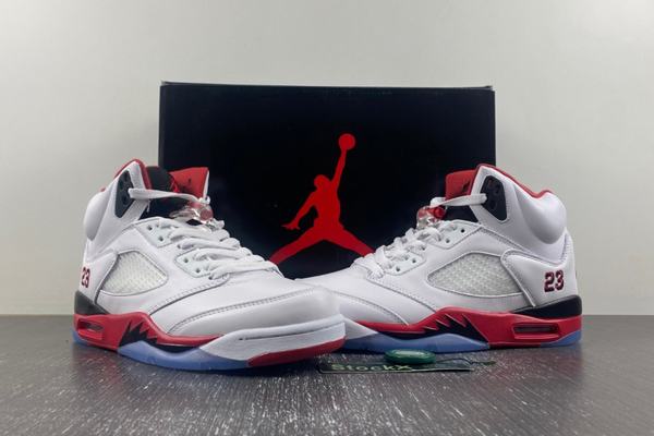 Air Jordan 5 "Fire Red" this shoe with its classic white, black and red color combination, showing a strong visual impact. The main color of white gives the shoes a fresh and pure temperament, showing the beauty of simplicity. The black embellishment adds calmness and mystery, making the overall shape more layered. And the bright red, just like a burning flame, instantly ignited people's passion and vitality. The "23" embroidery on the shoe body adds a unique charm to this shoe, paying tribute to basketball legend Michael Jordan.