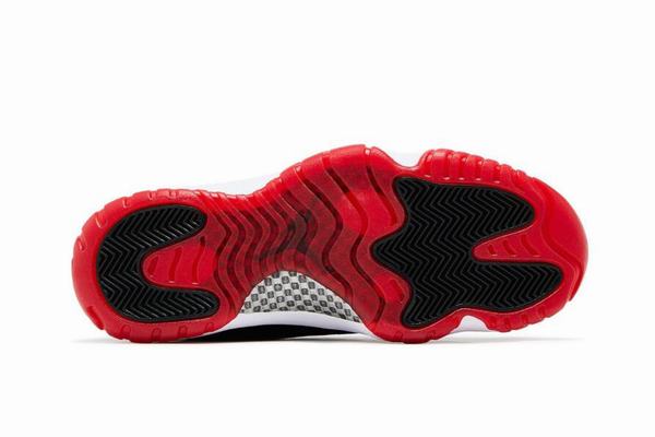 The side of the shoe has a red flying Man logo, this iconic element is very striking, red and black form a strong color contrast, adding a touch of bright color and movement to the whole shoe. The sole part is a highlight of this pair of shoes, the white middle sole and the red outsole match, this classic color combination reminiscent of the classic design of Air Jordan 11. The red outsole is not only visually striking, but also provides a good grip when walking or playing sports.