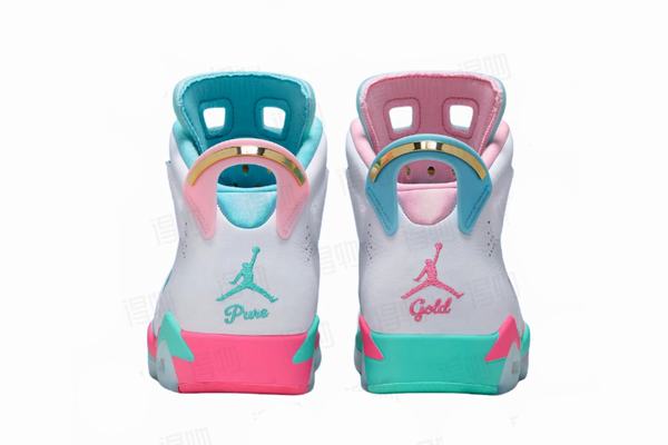 The shoes were created by designer Jillian Beagley, inspired by her "Mandarin duck" style from her basketball career. The upper of the white lychee skin material is asymmetrical, and the contrasting base of mint green and cherry blossom powder is gorgeous like a color palette. The Velcro at the collar can be freely replaced with a personalized embroidered badge. The head of the shoe is embroidered with the "Give life" public service declaration, and the pink Flying Man logo on jordans cheap the heel is an interesting contrast with the words "real gold", reflecting Jillian's life creed of "be true to yourself is real gold".