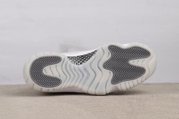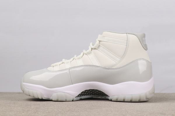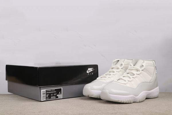 This shoe presents a simple yet sophisticated aesthetic.  The dominant white color scheme creates a fresh and impactful visual experience.  The high-quality leather upper features a fine, resilient texture, highlighting the shoe’s premium quality.  The signature patent leather panel on the side, with its understated shine, not only elevates the shoe’s style quotient but also serves as a classic identifier of the Air Jordan 11 series.  The metallic Jumpman logo on the shoe’s upper subtly reinforces the brand’s identity.