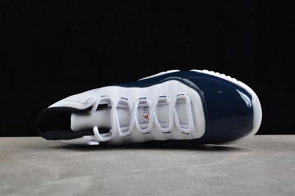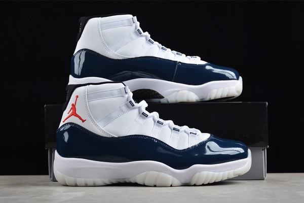 This release features a crisp white and blue color combination. The upper is primarily made of high-grade, white leather, providing a clean and sophisticated foundation. The side panels, a signature element of the AJ11, are crafted from a striking royal blue patent leather, offering a luxurious sheen. This patent leather detail is not only a fashionable accent but also a defining characteristic of the Air Jordan 11 silhouette. The bold red Jumpman logo on the upper adds a pop of color, becoming a visual centerpiece and reinforcing the shoe’s connection to the game.