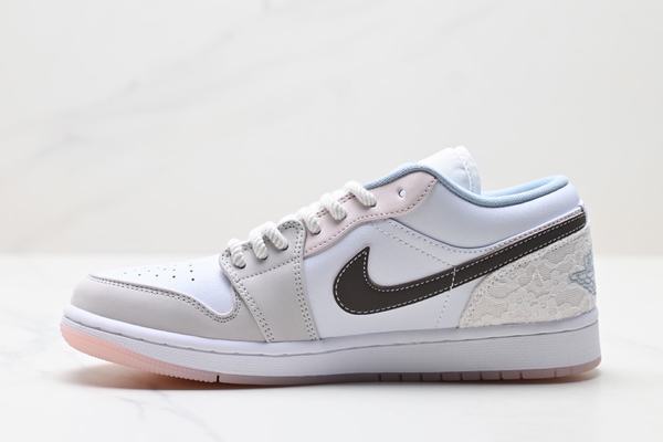 The Retro Air Jordan 1 Low “Pink Quartz” is a classic sneaker that masterfully blends feminine appeal with a cutting-edge style. Its design is both clever and one-of-a-kind. The upper is predominantly constructed from pure white leather, creating a sense of simplicity and freshness. This is beautifully offset by accents of cherry blossom pink, crafted from a through-core, top-layer lychee leather, lending a gentle and romantic feel that adds a touch of whimsy to the shoe. The iconic Swoosh, along with elements like the LACES, is rendered in a deep grey, providing a dramatic contrast to the main pink and white color scheme. This thoughtful design element adds a sense of visual interest and ensures the shoe remains fashionable while retaining its sweet aesthetic. The “Pink Quartz” iteration is a highly sought-after colorway within the Air Jordan 1 lineage, perfectly capturing the youthful feminine essence of romance and trend awareness.