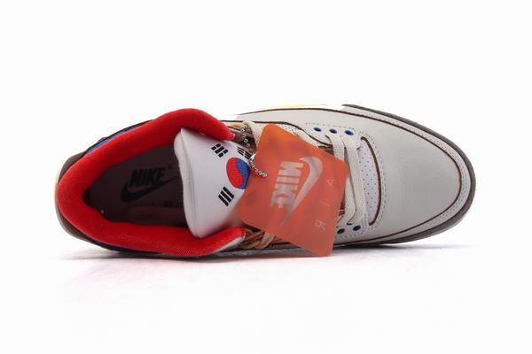This shoe’s design cleverly incorporates elements of the South Korean flag. The upper is made of white lychee leather, providing a textured feel and a vintage vibe. Accents of black, red, and blue adorn the collar and lining, creating a striking visual contrast that reflects the flag’s colors. The signature elephant print, running along the side from heel to toe, adds a unique identifier and carries forward the classic DNA of the Air Jordan 3.